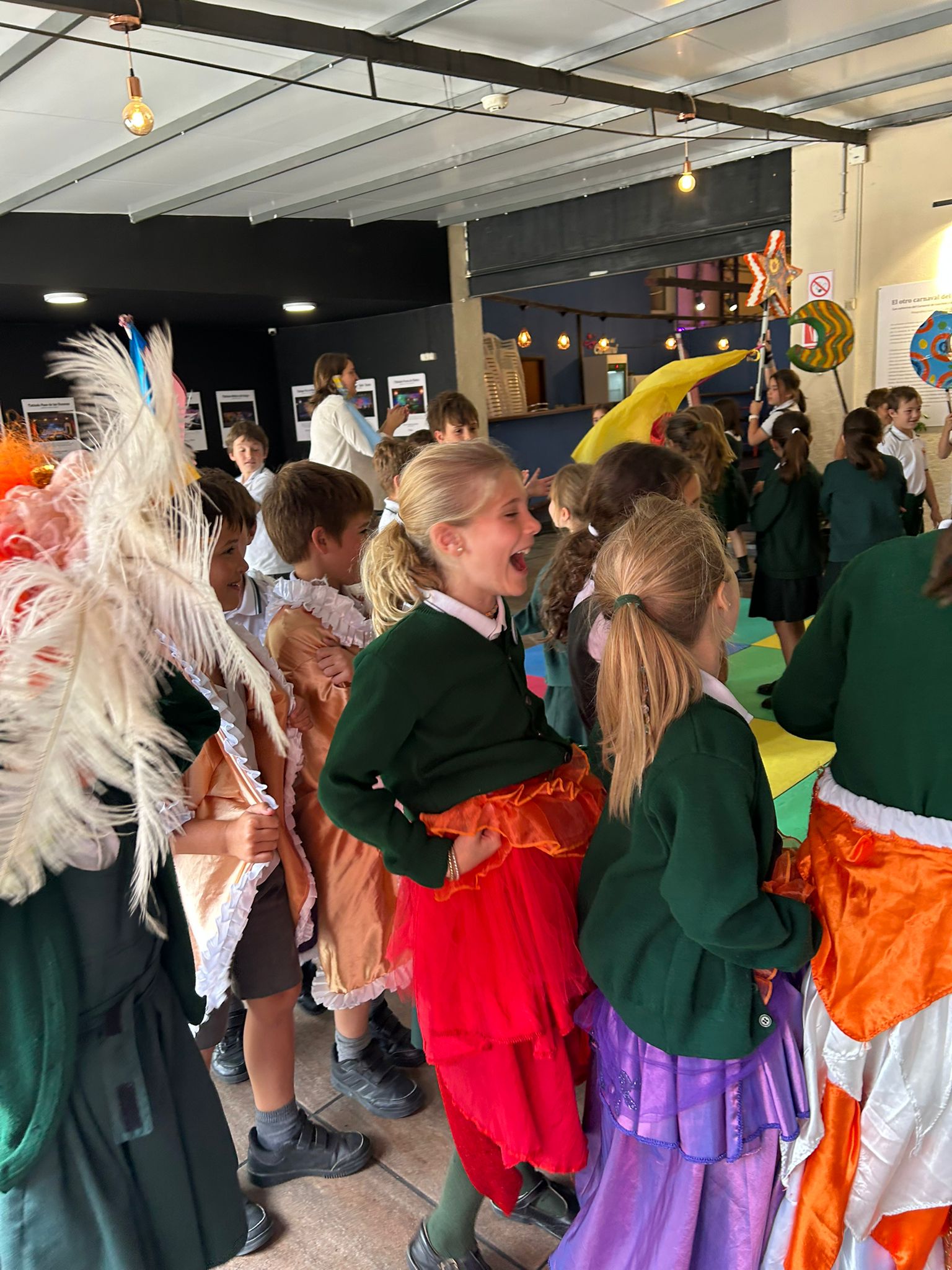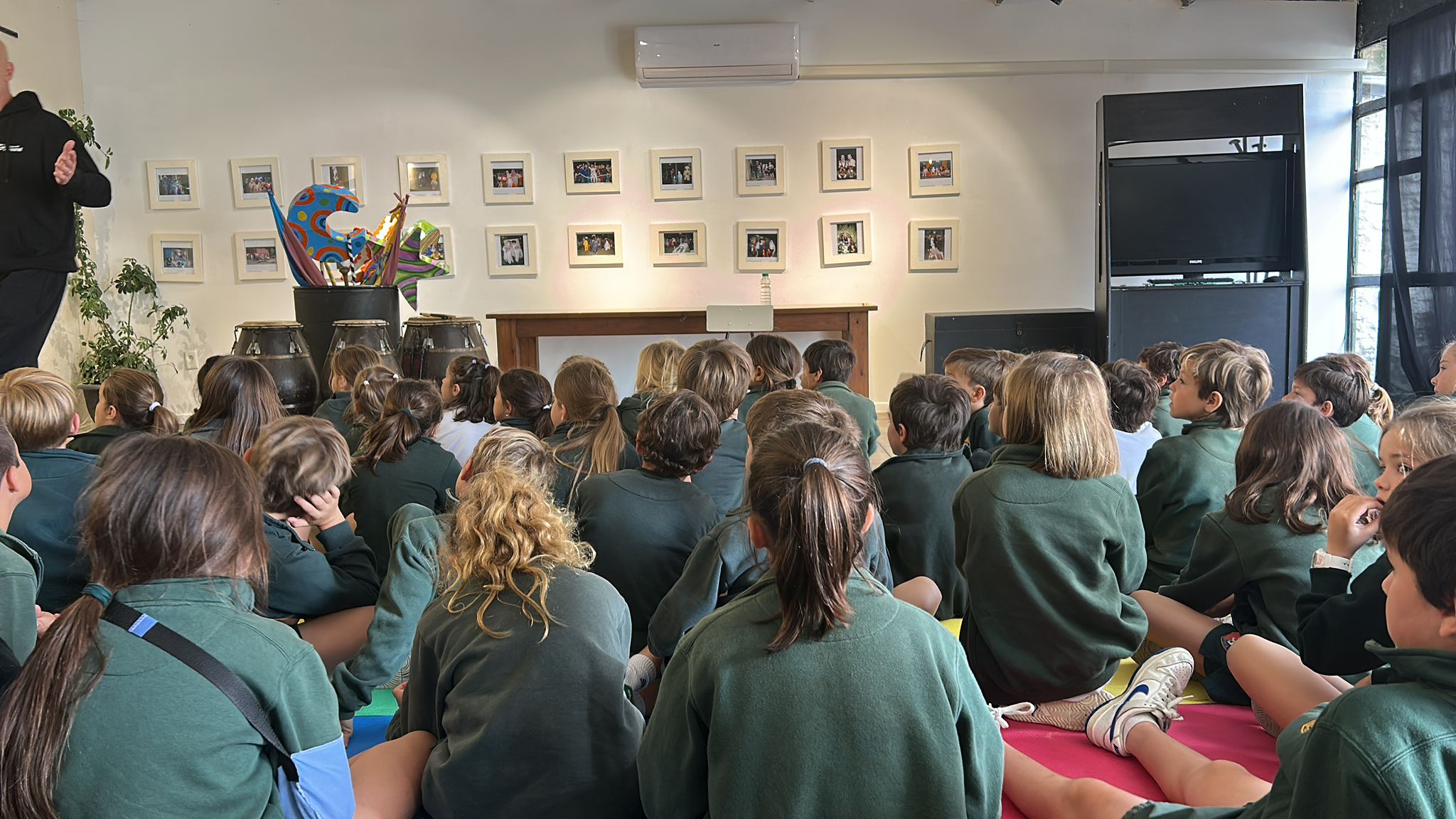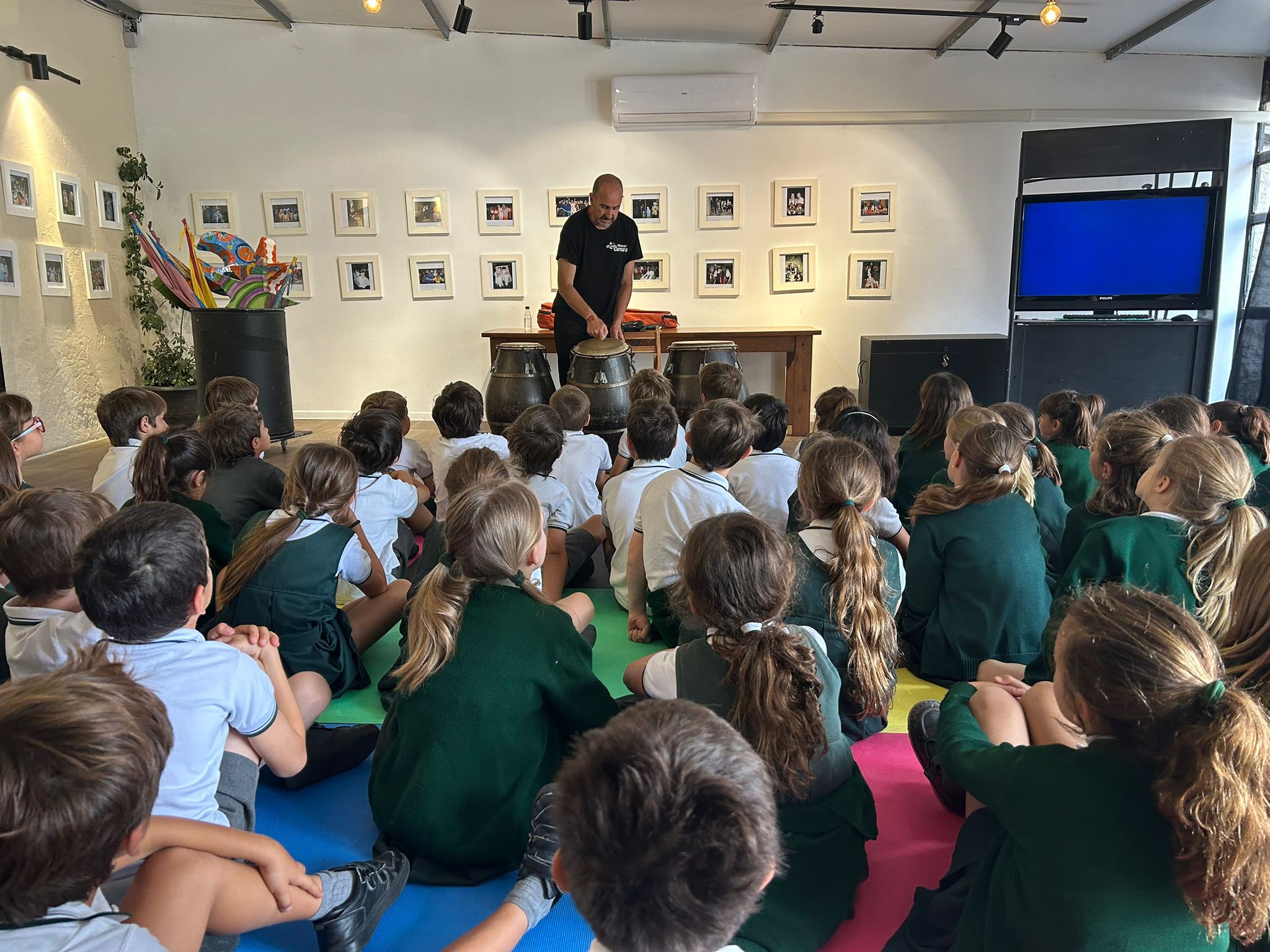 Los alumnos también participaron en experiencias interactivas, probándose vestuarios de carnaval y aprendiendo algunos pasos básicos de candombe. Exploraron cómo esta música refleja la diversidad del patrimonio uruguayo y cómo las comunidades ayudan a mantener vivas estas tradiciones.